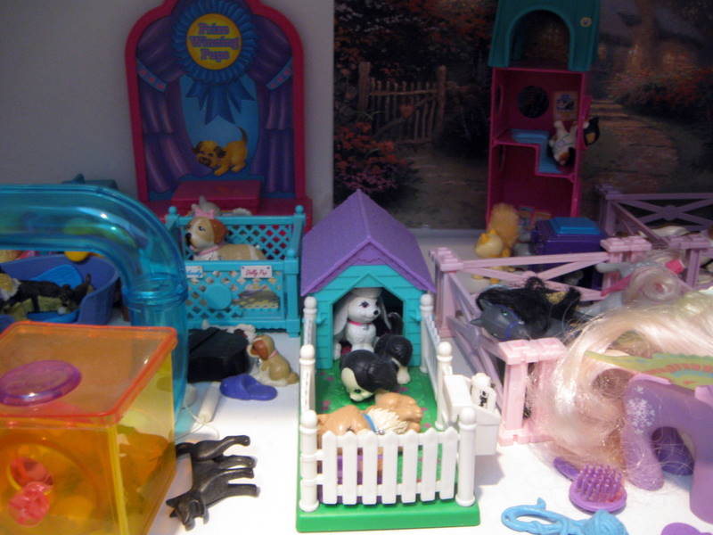 I wish I had a picture of the whole set up, pets on top, ponies on bottom, but I don't. My task when I was home a few weeks ago was to clean out my room and get rid of a lot of stuff, but I couldn't bring myself to part with these beloved toys. They're all packed up now in a big plastic bin under my bed with only the Polly Pockets and my dollhouse for company.